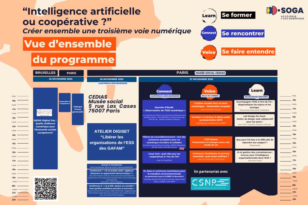 Le Social Good Accelerator (SoGA) organise la nouvelle édition du « Numérique en Commun[s] » ESS (NEC ESS) du 25 au 27 novembre 2025 autour d’une question cruciale : « Intelligence artificielle ou coopérative ? Créer ensemble une troisième voie numérique ». Informations et liens pour s’inscrire.
