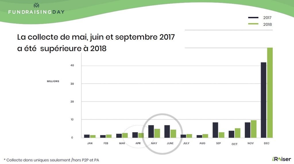 En 2018, le nombre de dons en ligne a progressé, passant de 550 000 transactions en 2017 à 588 000 transactions en 2018, soit une croissance de 6.9 %. Cependant, les montants collectés ont que légèrement augmenté entre 2017 et 2018 de 1,2 % et particulièrement sur les mois de mai, juin et septembre.