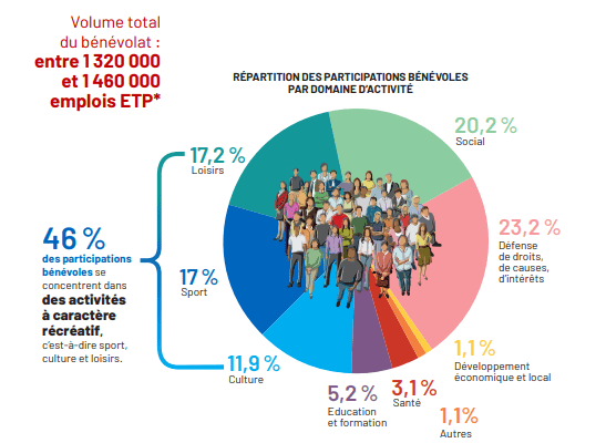 Le bénévolat en France représente entre 1 320 000 et 1 460 000 emplois en équivalent temps plein.