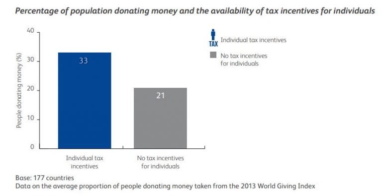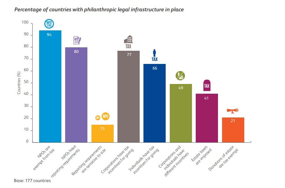 Un chiffre encourageant concerne le pourcentage des pays réalisant des incitations fiscales à donner. De fait, 77 % de pays mettent en place des incitations fiscales aux sociétés et 66% des incitations fiscales aux donateurs individuels.