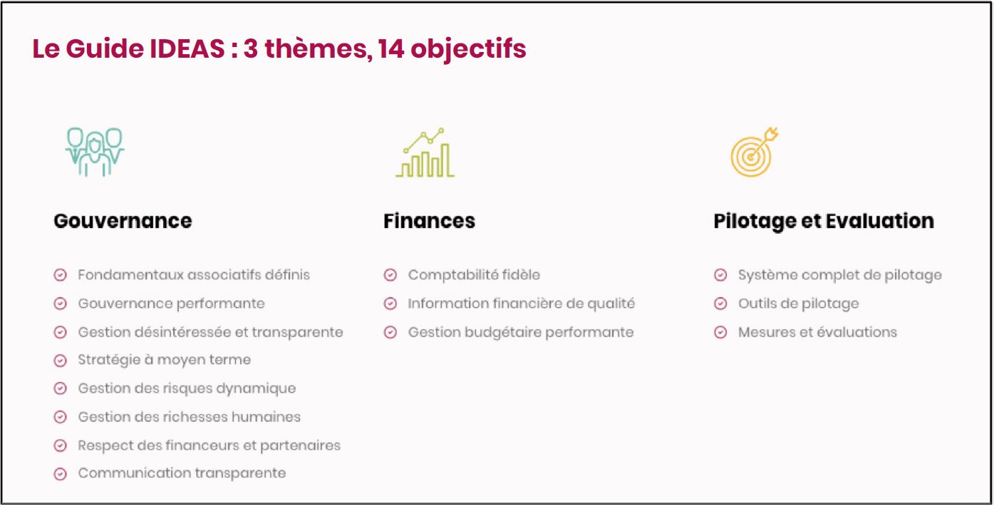 IDEAS vient de sortir la nouvelle édition de ce guide, dans l’objectif de renforcer les capacités des associations et fondations face enjeux actuels en regroupant 90 bonnes pratiques pour les aider à avoir une dynamique d’amélioration continue. Celui ci est à destination des dirigeants et de leurs équipes.