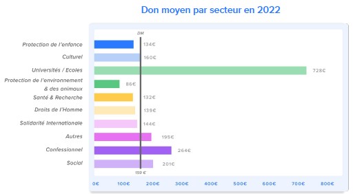 Le don moyen est lui aussi très dépendant du secteur de mission sociale de l’organisation soutenue. En effet, nous voyons un don moyen tous secteurs à 159 € en 2022 mais qui va de 86 € pour le secteur de la protection de l’environnement et des animaux à 264 € pour le secteur confessionnel et 728 € pour le secteur des universités et des écoles.