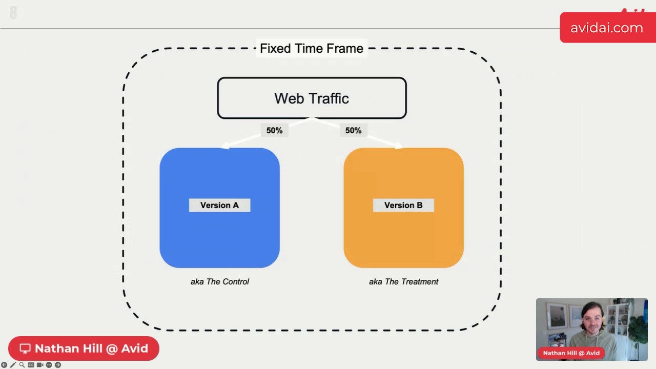 Dans un test AB, ce que nous faisons, c’est prendre le trafic de votre site web. Ou peut-être même les personnes auxquelles vous envoyez un e-mail. Et en même temps, dans un laps de temps défini, vous divisez ce trafic par deux. Ainsi, la moitié d’entre eux voient la version A, peut-être une version d’une page avec un bouton bleu, et l’autre moitié voit la version B ou le traitement et la version de la page avec le bouton orange. Ce n’est pas le test le plus efficace.