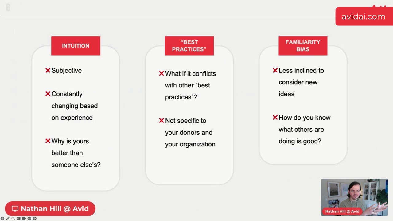 Et souvent, quelqu’un a essayé quelque chose une fois ici et a peut-être pensé que c’était une bonne pratique. Et puis ça a été transmis de bouche à oreille. Et si les meilleures pratiques sont en conflit les unes avec les autres ? Les meilleures pratiques ne sont pas spécifiques à vous et à vos donateurs dans votre organisation. Nous devons donc tester ces choses pour voir si elles fonctionnent réellement.