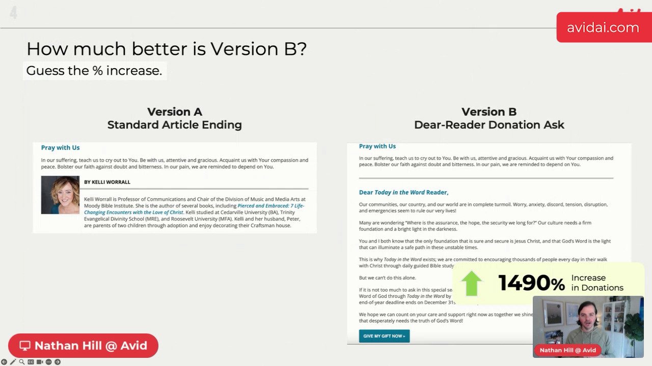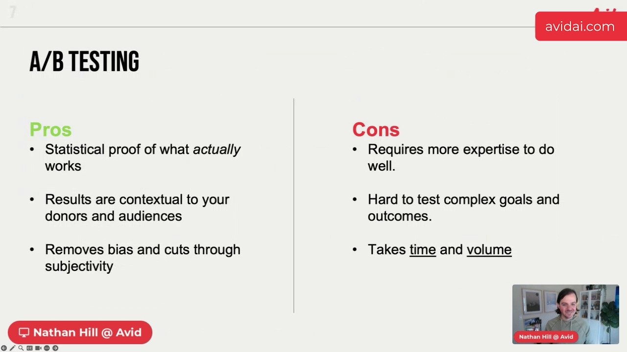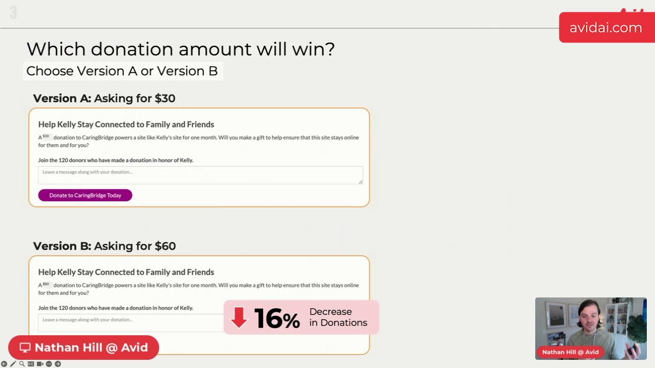 Dans ce cadre, Nathan Hill, vice-président de la formation de Avid et ancien vice-président de NextAfter a pris la parole pour revenir sur les techniques et valeurs ajoutées de l’AB test. Voici son témoignage en vidéo et la transcription en Français ci-dessous (attention traduction automatique en FR).