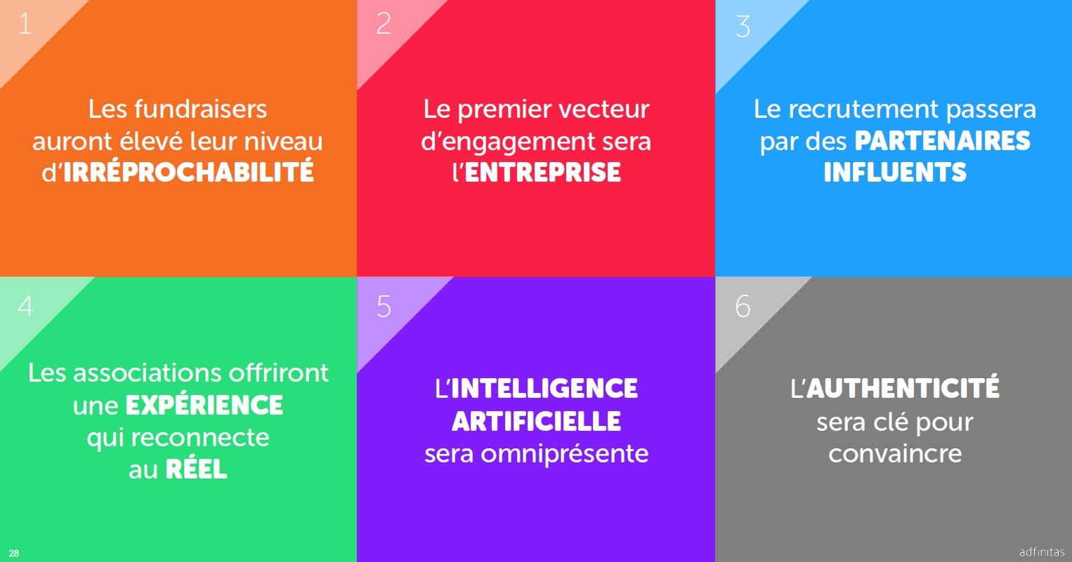 Adfinitas a ressemblé 109 sources différentes pour créer ce recueil et analyser avec différentes variables des tendances de fonds qui se dessinent dans notre écosystème de la générosité. Ils présentent alors 6 prédictions pour 2030, avec des avis d’experts, leurs raisons d’y croire, l’impact sur la collecte et des cas parlants.