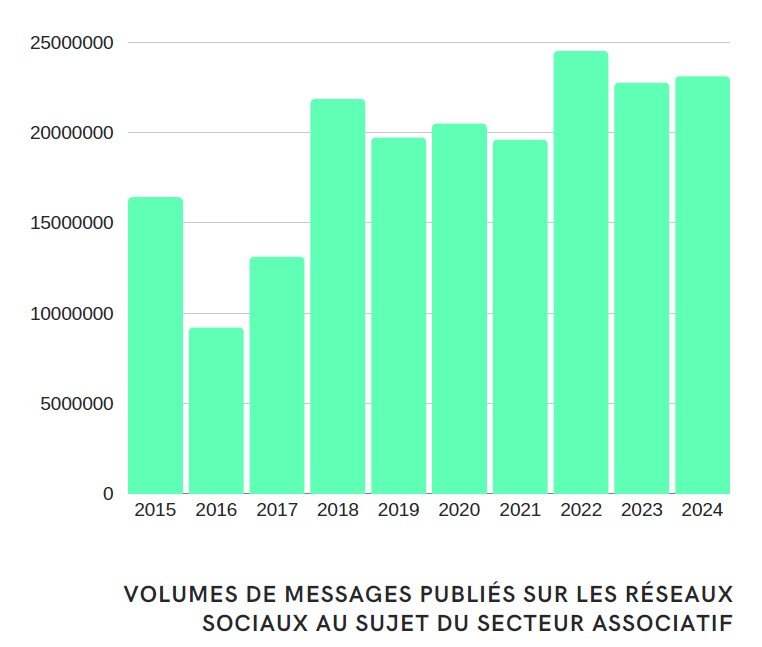 Le secteur associatif démontre une vitalité remarquable sur les réseaux sociaux, avec un engagement qui ne cesse de se renforcer. Propulsé à partir de 2018, l’étude démontre que notre secteur associatif bénéficie d’une visibilité constante, culminant à plus de 23,1 millions de messages publiés en 2024 en lien avec les associations, soit une augmentation de 40% par rapport à 2015. Cette dynamique s’est stabilisée à un niveau élevé depuis 2022, avec un volume annuel oscillant entre 23 et 24 millions de messages, attestant d’un intérêt solide et durable pour les causes associatives dans l’écosystème numérique.