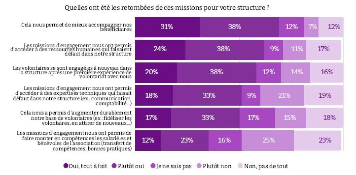 Pour les associations, le premier impact est bien évidemment la pérennité de leurs actions sociales à 87% grâce à ces nouvelles compétences et dons de temps, mais également un meilleur impact auprès de leurs bénéficiaires à 57 %.