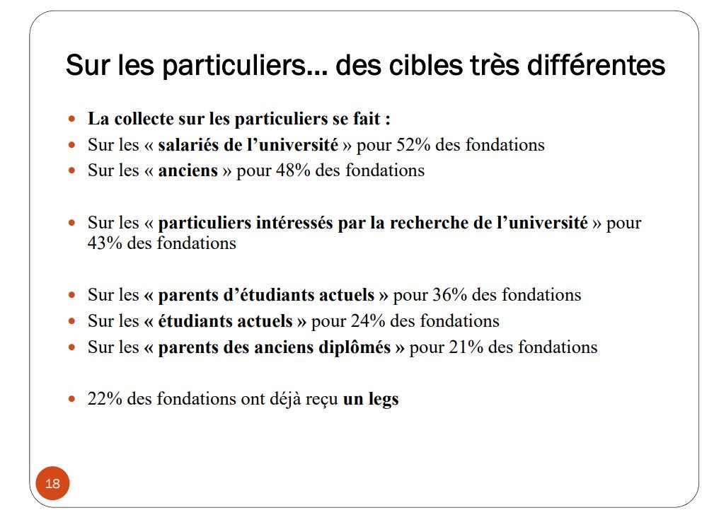 L’étude montre avec grande surprise que seulement 48 % des fondations universitaires récoltent des fonds auprès des étudiants et que 36 % d’entres elles récoltent auprès des parents d’étudiants.