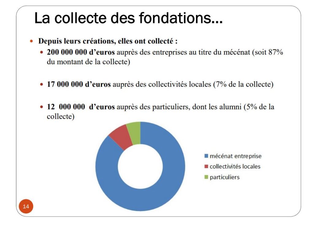 On peut noter cependant une disparité de collecte très forte selon les fondations. Par exemple, sur le mécénat d’entreprise, certaines ont collecté au total 14 000 euros depuis leur création tandis qu’une autre a collecté 30 millions.